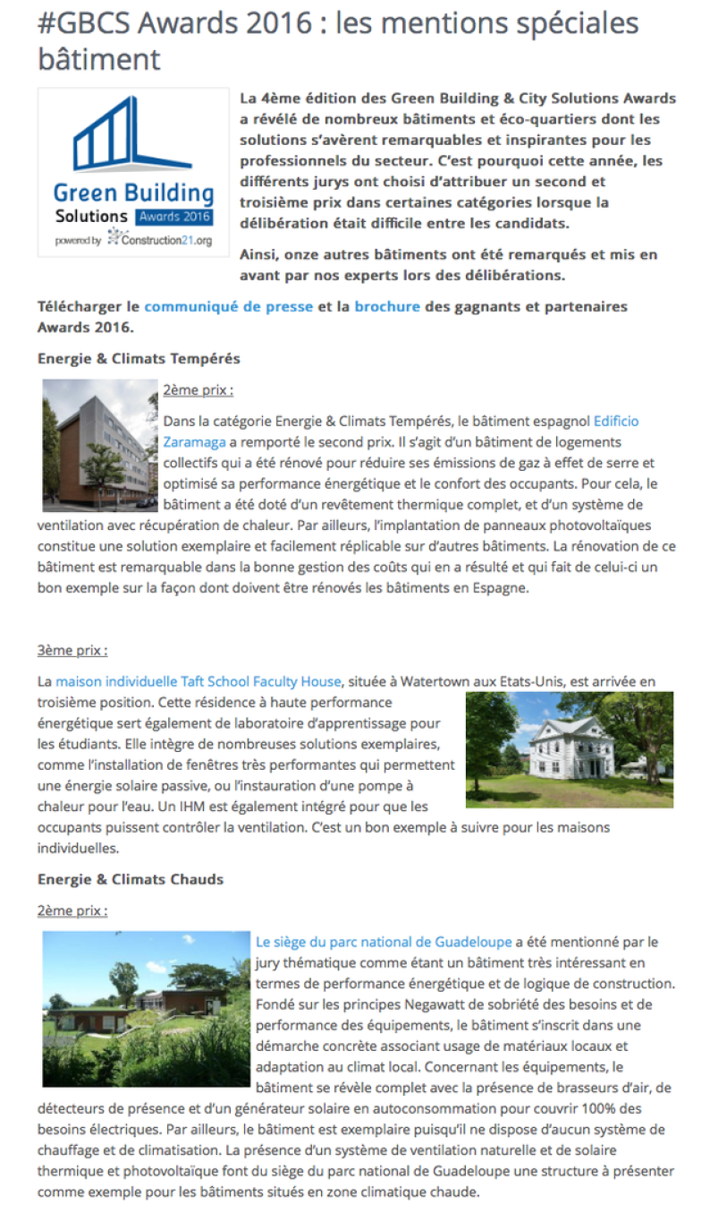 MENTION AUX GREEN BUILDING SOLUTION AWARD 2016
